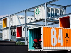 這是由兩個(gè)超寬的40尺箱體、兩個(gè)標(biāo)準(zhǔn)的40尺箱體以及鋼架構(gòu)組合搭建而成,一只超寬箱體以及一只標(biāo)準(zhǔn)箱前后安放拼接組成一個(gè)整體,兩組拼接箱體分別放置在兩旁,中[查看詳情]