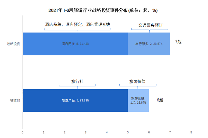 投融資金額:億元級以上的事件占比近50%。從融資金額來看,2021年1-6月,旅游行業億級及以上事件共11起,占投融資總數的35.48%;其中億級事件共發生9起,十億級事件共發生2起;這2起十億級事件的金額分別為62.44億人民幣和2億美元。