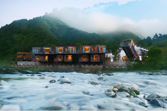 獨(dú)特集裝箱建筑坐落于美妙的山水之間,房間露天陽(yáng)臺(tái)正對(duì)著外面的大山和流水,晚上能聽(tīng)到靜靜地流水聲,落地大窗戶,躺在床上就能看到遠(yuǎn)處的風(fēng)景。