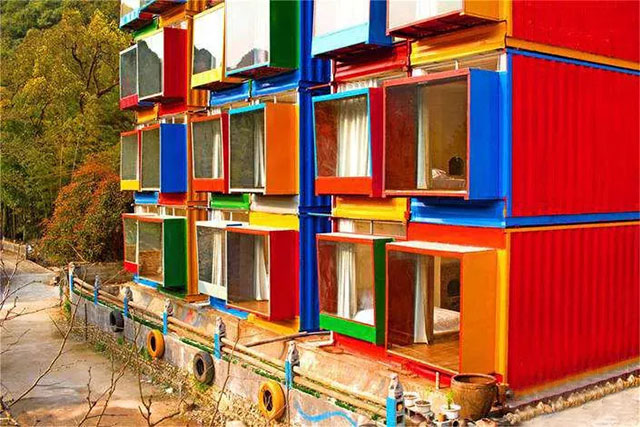 初見畬隱就有一種驚艷的感覺,畬隱的客房由12個(gè)集裝箱組成,外表被涂成七色彩虹,遠(yuǎn)遠(yuǎn)望去猶如架在山水田園間的彩虹橋,達(dá)到了工業(yè)風(fēng)和田園風(fēng)的完美結(jié)合。