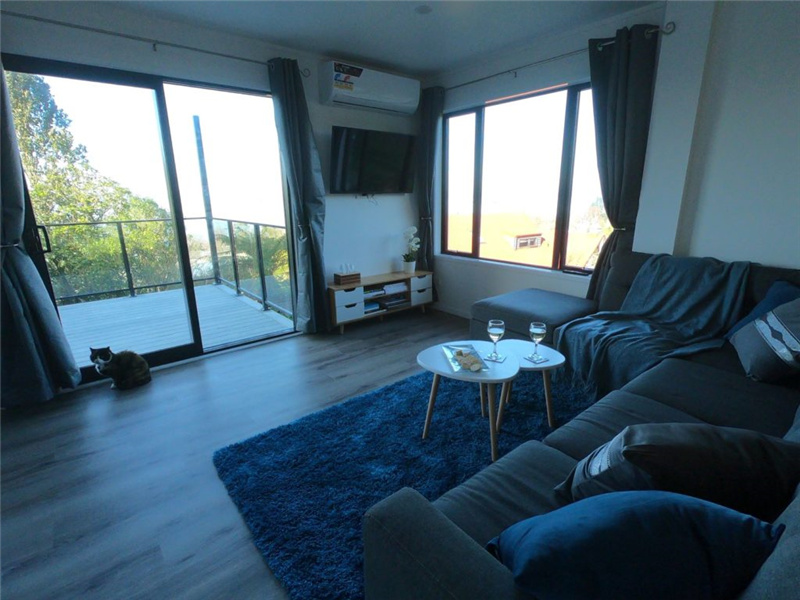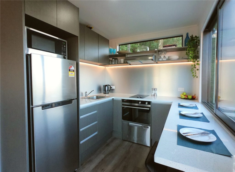 開放式的廚房位于客廳的旁邊,擁有一個可觀景的就餐桌。廚房的設備齊全,可以在這里完成各種烹飪菜品。頂部還有一個條形天窗,為空間帶來充足的自然光線。