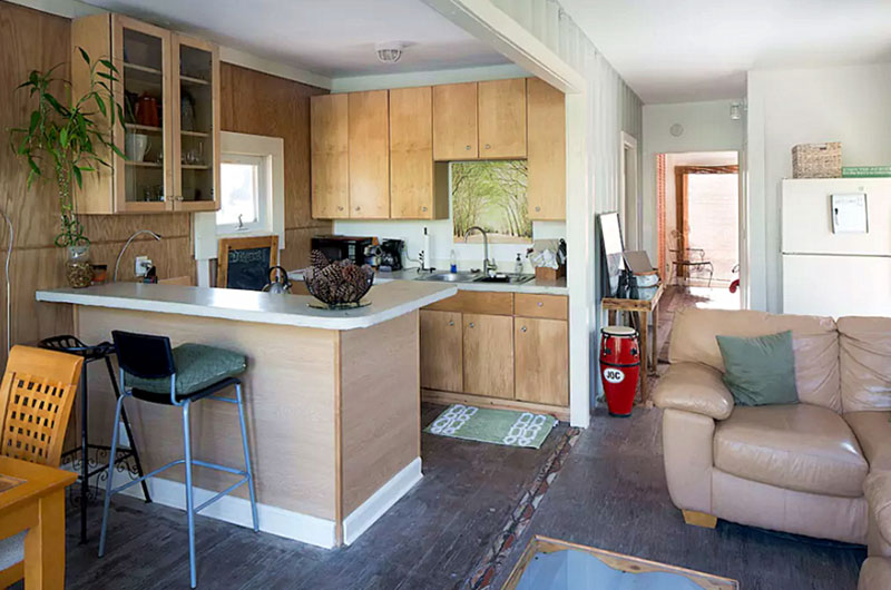 為了消除集裝箱堅硬寒冷的感覺,屋內采用了大量溫暖淳樸的木材:木地板、木墻面、木桌子、木制儲物柜等等,營造輕松舒適的氛圍;箱體平拼接處的側板部分切除,起居室、廚房以及餐廳相互連通,公共區域開放式的設計增強了內部的空間感,顯得更為寬敞明亮;起居室安裝了白色的內墻板,咋眼一看與傳統房屋無異。