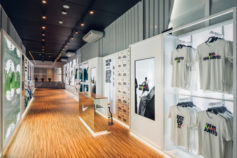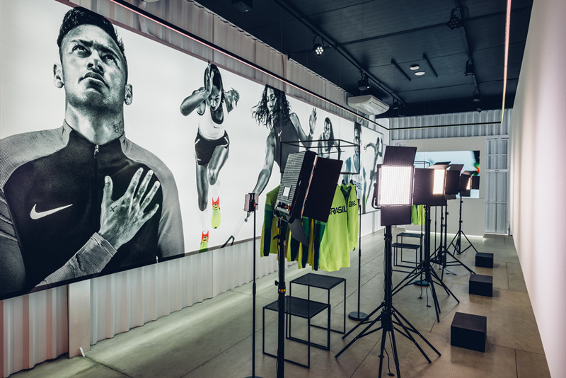 整體內部風格簡約時尚,營造輕松舒適的感覺,看著兩側帶有Nike標志的產品以及廣告,讓人印象深刻,達到品牌宣傳的效果。