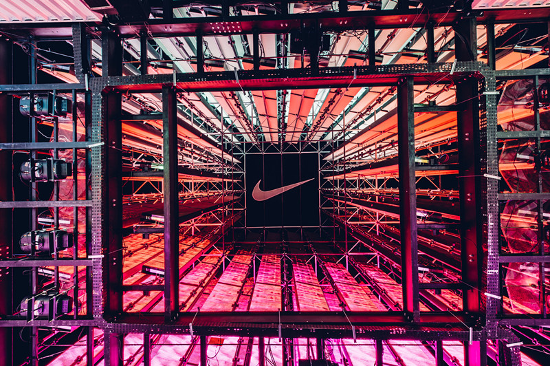 當然,值得一提的還有中間鋼架構搭建的方形廣告架,從地下往上看,你可以看到許多金屬組合碰撞出壯觀的景象,大大的Nike標志位于正中間,設計獨特,形象地體現了金屬美學的概念。