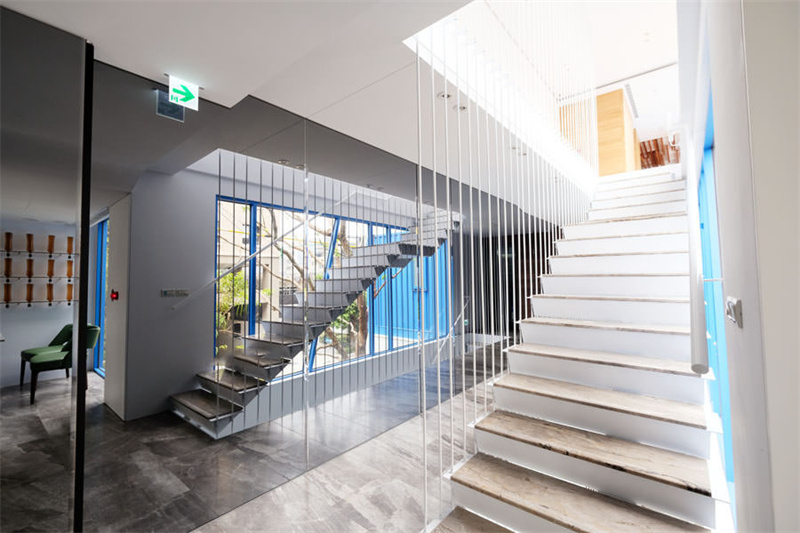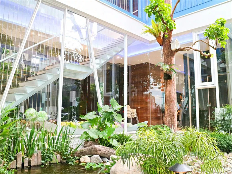 三層樓的設(shè)計皆不相同,一樓以密集板加上2D激光,打造出海浪輕涌的造型。門前利用與人行道相接的一小塊空地規(guī)劃生態(tài)池、種植茄苳。路人經(jīng)常被外觀所吸引。