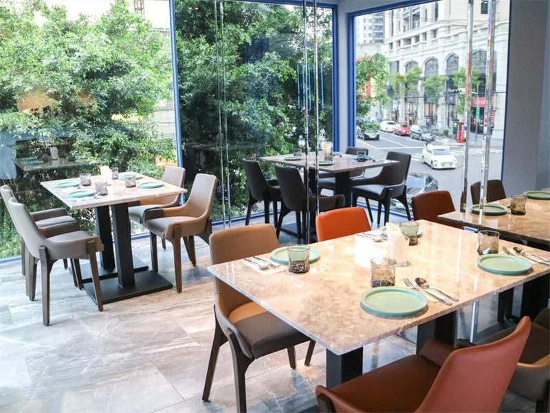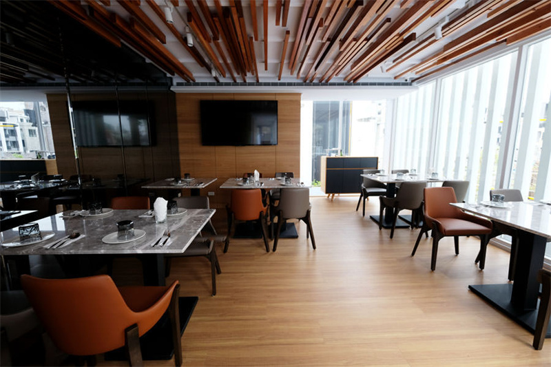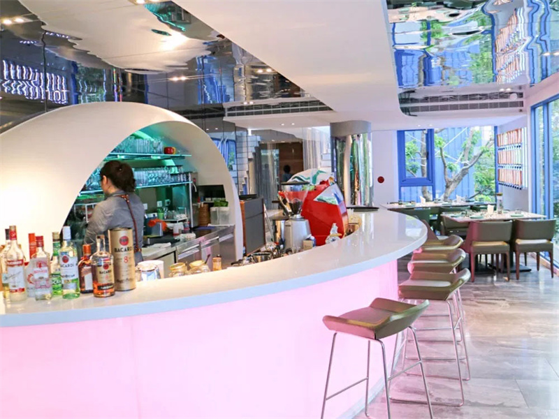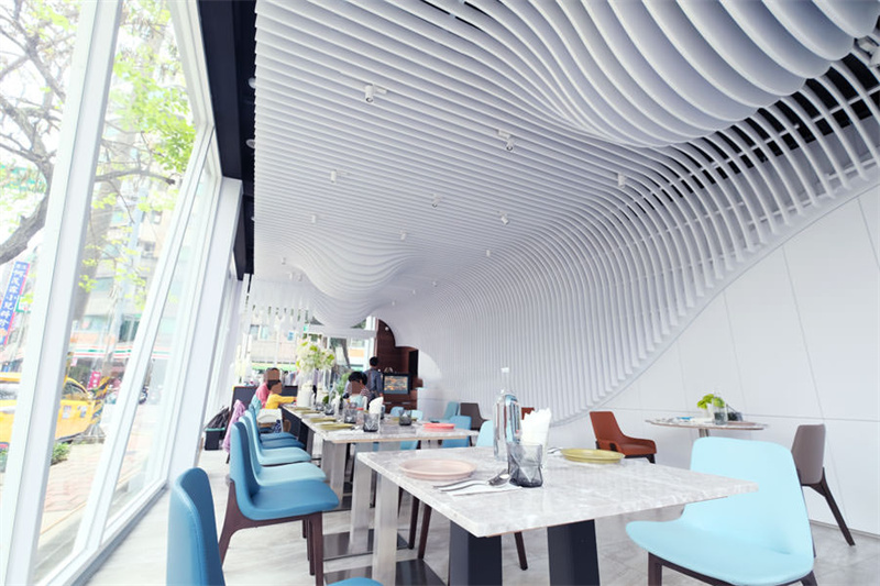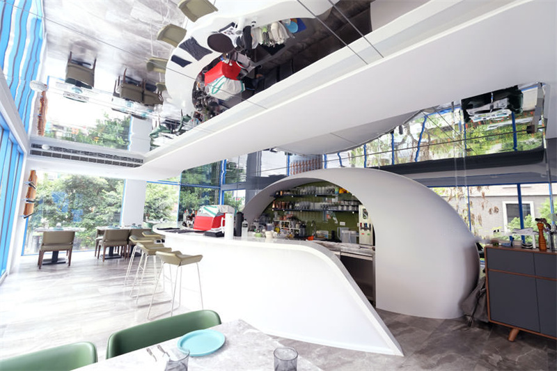 一樓主要為落地玻璃的透光設(shè)計,靠墻一邊的天花是片狀材料拼成的水滴型裝飾,極具現(xiàn)代感和藝術(shù)線條美,讓環(huán)境瞬間變得高大上起來,引起視覺上的愉悅,有利于顧客用餐心情。