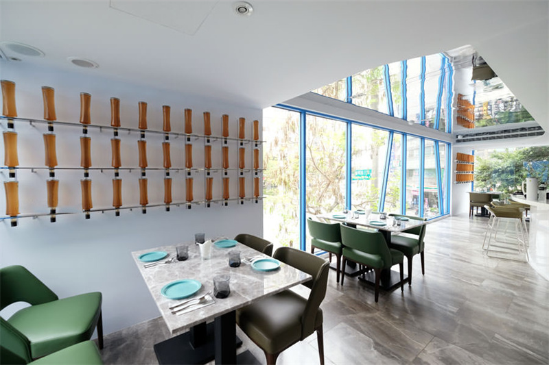 負(fù)責(zé)設(shè)計該餐廳的設(shè)計師表示,該土地寬6公尺、長約37公尺,面積不大且呈現(xiàn)狹長型,周圍皆為新大樓,有許多花園景觀。因此該餐廳采用了大量玻璃,引光納景,增強(qiáng)穿透性。