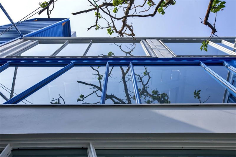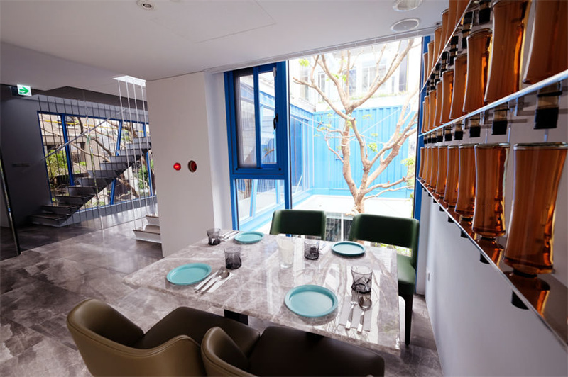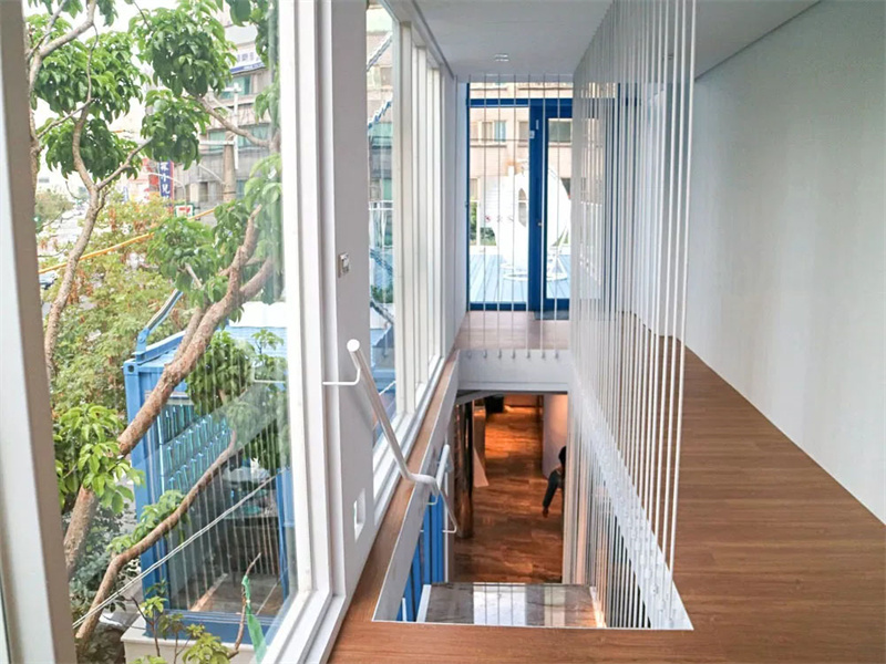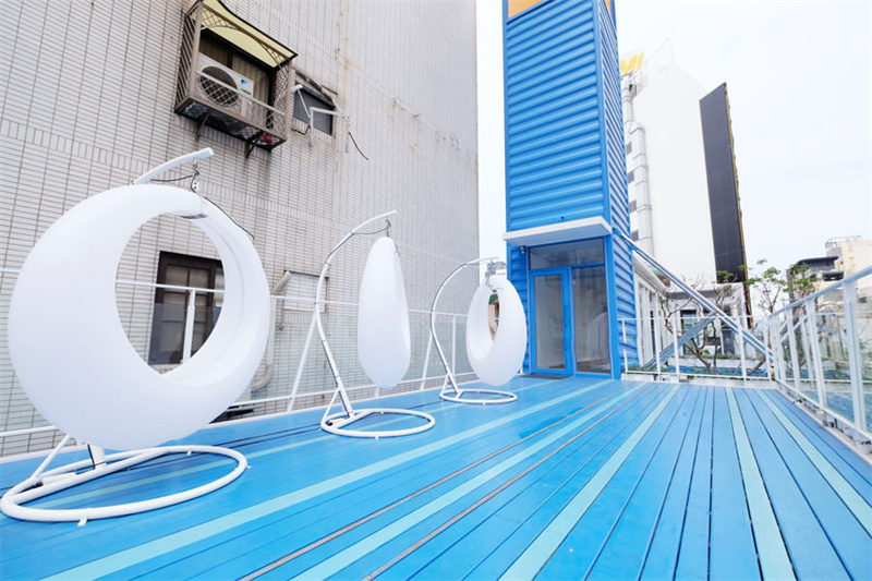 看到如此熟悉的紋路,就應(yīng)該知道這又是一家集裝箱改造而成的三層建筑了。然而事實(shí)是建筑的外表僅以集裝箱鐵皮作為裝飾,實(shí)則為鋼骨結(jié)構(gòu)。外觀以藍(lán)白為主,形似一艘大船停泊在路邊。