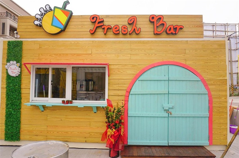 【Fresh Bar】鮮果吧,以大地色系為主的迷你城堡,最重要是它比較有特色,外觀看上去不像是貨柜箱,實際上是用木板搭配上一些裝飾,包裹著集裝箱,讓整個商鋪給人一種仿佛置身于童話式的城堡中。室內充滿著綠色的元素,享受食物之余還能感受著這種綠色的氣氛。