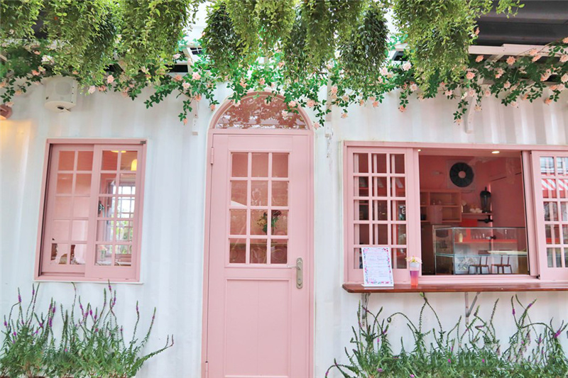 最特別的要數(shù)這個“心形窗”的集裝箱,位于二層的它擁有絕佳的地理優(yōu)勢。室內(nèi)被全部漆成粉紅色,天花上掛滿了干花,打造了一個宛如“花路”的通道,成為少女游客的必打卡點。