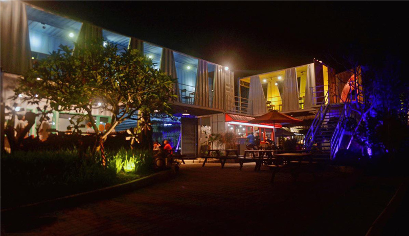 點餐之后,游客可以在園區(qū)內(nèi)自行尋找座位就餐。位于一樓的是戶外座位區(qū),二樓的則為集裝箱座位,這些箱身都被剪裁成不同的形狀,不規(guī)則的窗戶打造了一個流通舒適的環(huán)境。