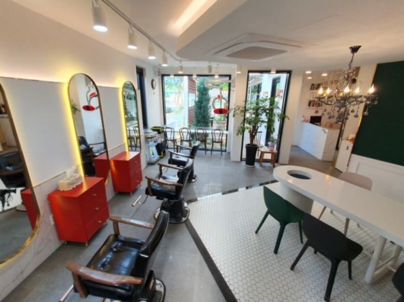 進入美容院室內,內部環境就和外觀一樣整潔和清新。工作區內放置沙龍椅、鏡子和工作柜等,配套齊全的美容美發工具。白、綠搭配的裝潢色調營造了高級奢華的氛圍感,并在天花板安裝水晶吊燈點綴。