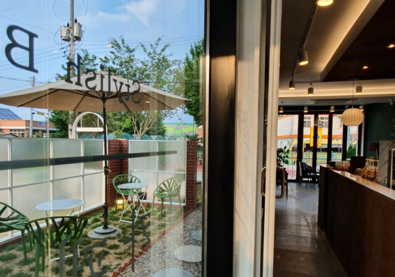 從工作區走到美容院的另一個功能區,這邊是配備了茶水間的休息區,為顧客提供貼心的等待區域。角落的吧臺使用木制材料覆蓋,并配備齊全的茶水調制工具,休息區內放置了許多簡易的木制桌椅,靠窗而設的卡座可以欣賞到戶外的美景。
