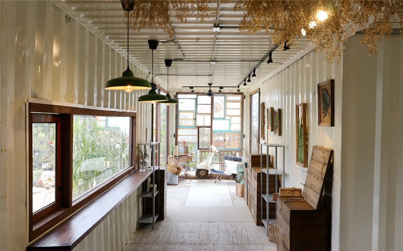 在這條公路上有非常多可以逛的店家,唯獨這家比較特別,用集裝箱搭建起來的植物售賣商店,名叫綠果庭院。綠果庭院是多肉控的天堂,利用集裝箱房和木質材料營造了一個獨特的休閑空間,戶外懷舊窗戶的拼接,盡顯復古風,讓整體建筑看起來不不單調。