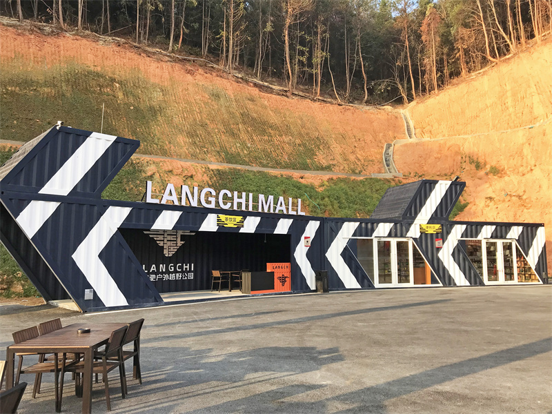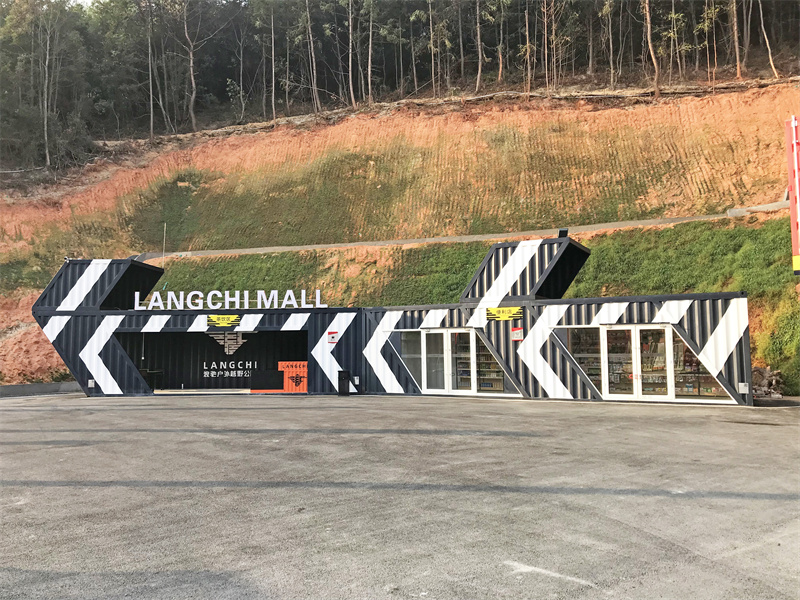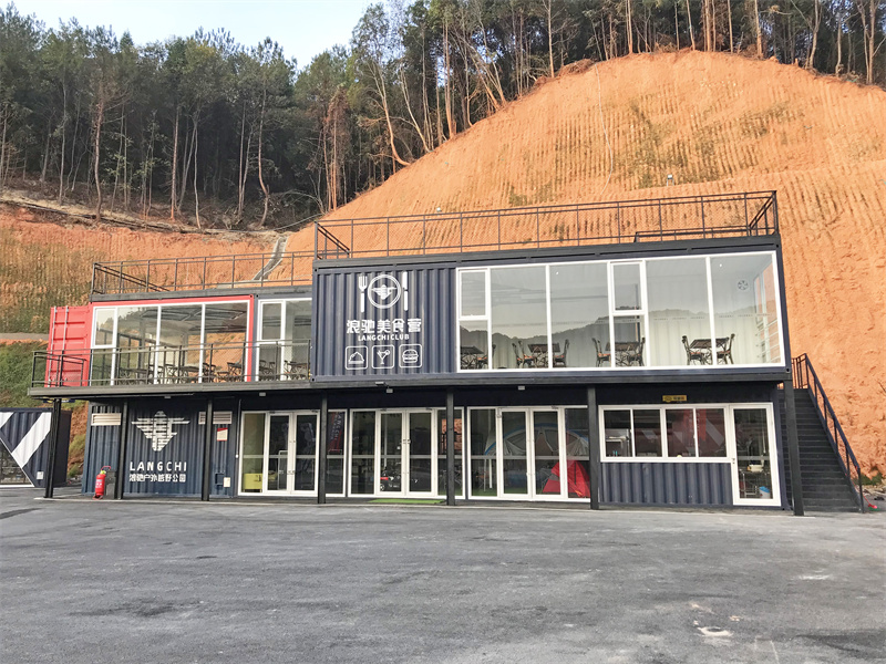 靠進(jìn)山腳的一邊還有一座以黑色為主打色的休息區(qū),同樣是由集裝箱改造而成的二層建筑。這座建筑的特色在于由其原始箱門打開而形成的露臺(tái),在底層面積比上層少的情況下,二層用了鋼架構(gòu)來(lái)加固。