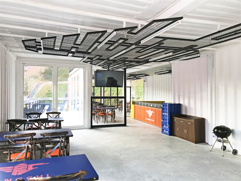室內(nèi)摒除了內(nèi)墻板和保溫的材料,采用裸裝的風(fēng)格,更能讓集裝箱與環(huán)境相互融合,結(jié)合天花網(wǎng)狀吊燈裝飾,更能體現(xiàn)工業(yè)風(fēng)的美態(tài)。