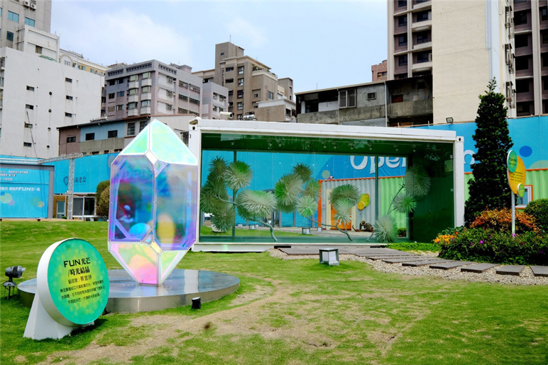 從旁邊的小道進去,就可以繞著藝術園進行順時針的參觀游覽。首先是一個名為“FUN 光芒”的作品,由雕刻藝術家設計并創(chuàng)造。發(fā)散陽光成為美麗光彩的水晶體就像時光的結晶,在不同時間角度的照耀下透析出不同的光芒。然后是一個“養(yǎng)著”青松的透明集裝箱,兩面箱壁替換成落地玻璃用于展示。