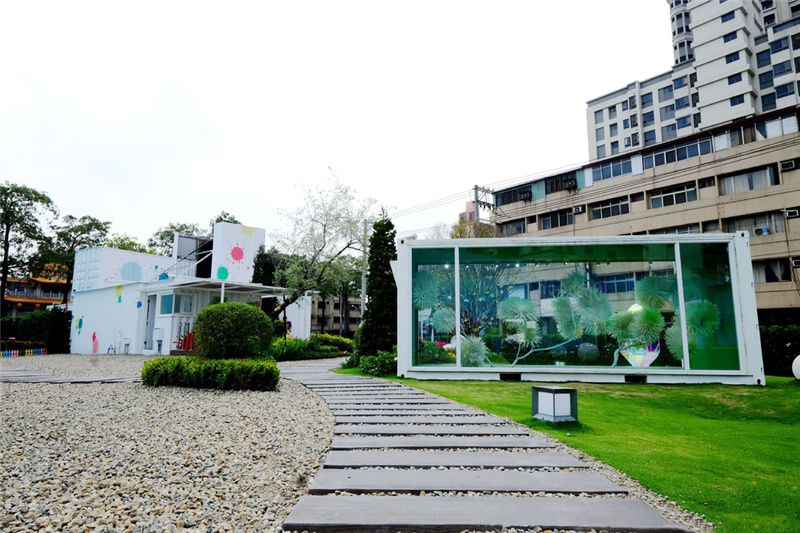 園區(qū)內有一座座集裝箱房打造成有趣的裝置藝術,其中一座純白油漆潑痕點綴堆疊而成的集裝箱屋,是園區(qū)里面的“藝術駐村中心”,而服務臺也位于此處。
