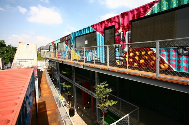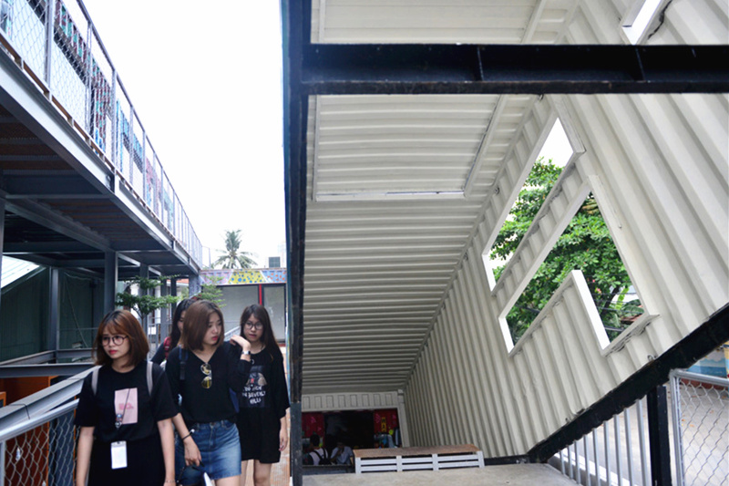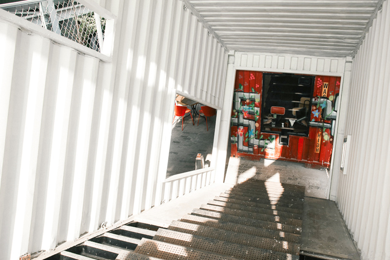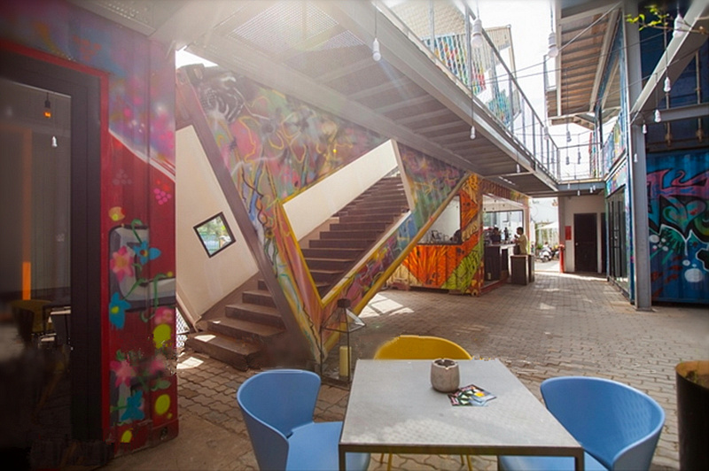 個(gè)性的涂鴉展現(xiàn)年輕活力,傾斜擺放的貨柜樓梯是一大亮點(diǎn),成了最近當(dāng)?shù)厍嗄昱恼沾蚩ㄖ亍?