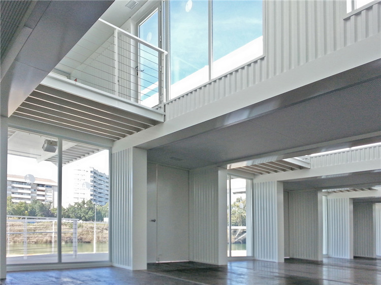 該項目在建筑形態上的構成,是先將高立方體集裝箱平行排列,再將標準集裝箱放置在其上,起到天窗的作用。這里的空間既有單層也有雙層,波浪狀金屬墻面將模塊化的結構暴露在外,為在這里舉辦的活動創造了具有吸引力而又適宜的空間。