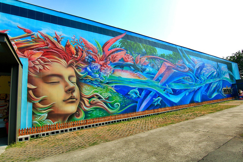 另一側(cè)的巨型集裝箱彩繪也是海洋世界,但呈現(xiàn)的是另一個(gè)主題,這個(gè)主題更加貼近自然生態(tài)的和諧統(tǒng)一,還有許多可愛(ài)的小動(dòng)物躍然箱上。再過(guò)來(lái)是西方神話故事一樣的唯美人臉,巨型的畫(huà)作毫無(wú)斷層,銜接流暢,實(shí)屬創(chuàng)作不易。
