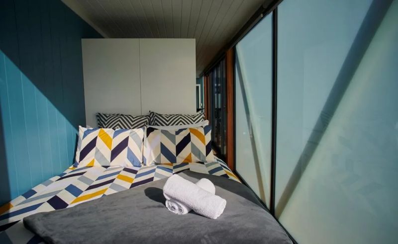 房屋的另一邊是一柜之隔的臥室,一張舒適的雙人床靠墻而設,全透玻璃窗擁有磨砂窗簾,在需要私密環境的時候便可以打開使用。房屋內的軟裝材料都挑選了令人舒適的材質和色調,布置溫馨,讓住戶可以真正享受休息。
