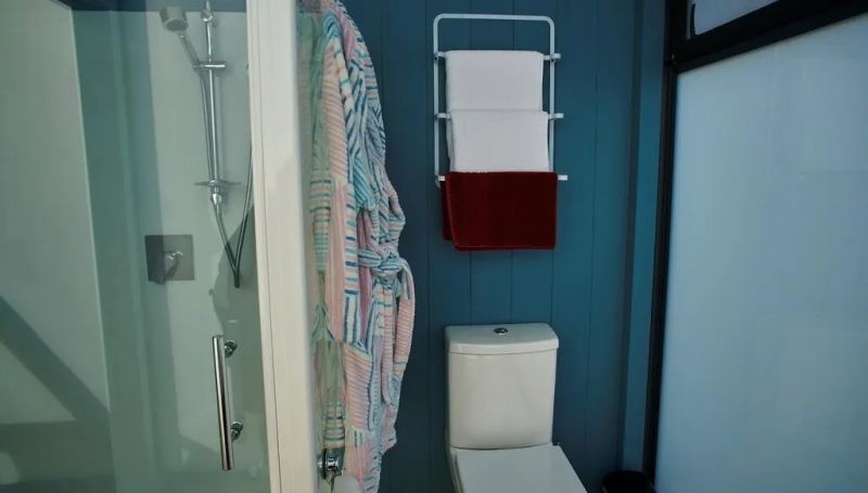 衛浴間設置在該集裝箱的一個末端位置,小巧的空間內擁有獨立的浴室,用玻璃立板圍起。一旁磨砂的玻璃窗既能透光又能保持私密性,打造了節能的生活場所。