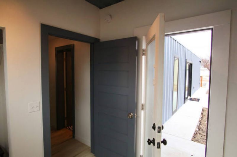 這是一所由三個集裝箱建造而成的私人住所,坐落于草坪上的它擁有木柵欄圍起的小庭院、小徑和小露臺。房屋的主要入口是一扇全景的玻璃門,大面積的采光為室內創造了明亮寬敞的環境。廚房內的主要家電和櫥柜已經配備齊全,這些都是在工廠預設好了,搬運到當地組裝后便可以直接使用。