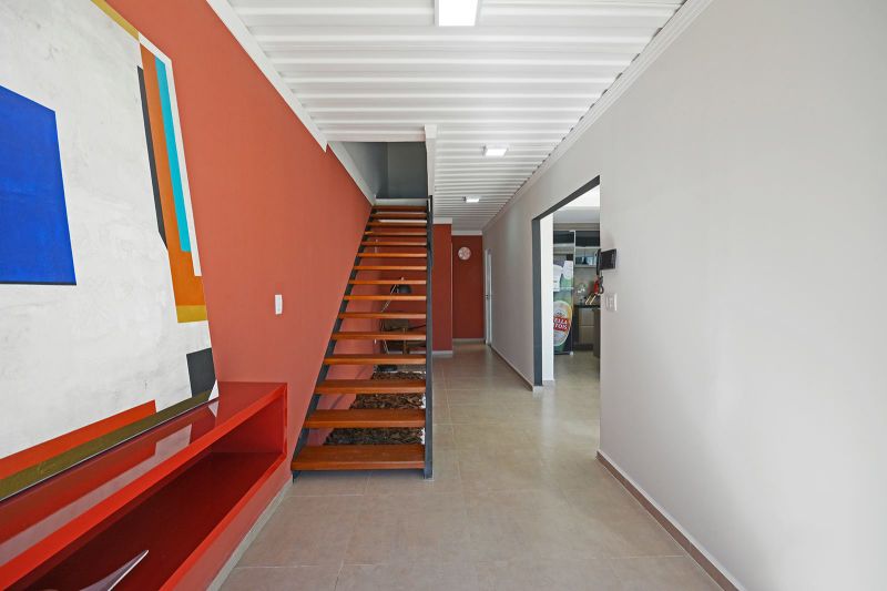 從向外突出的一個集裝箱單元進入住宅內部,這是一個安放上樓階梯的空間。紅白兩種顏色的碰撞為室內帶來了活躍的視覺效果,鏤空的鐵梯下還藏有一個小小的閱讀角。