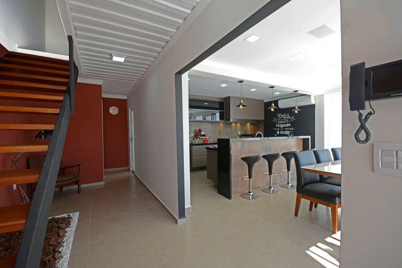 開放式廚房位于樓梯走廊的旁邊,一個大理石貼面的吧臺將廚房和就餐區分隔開來,從天花板上垂吊下來的燈泡為空間增添了一絲復古的味道。空間的四周都被落地玻璃窗包圍,因此室內光線充足,明亮且寬敞。