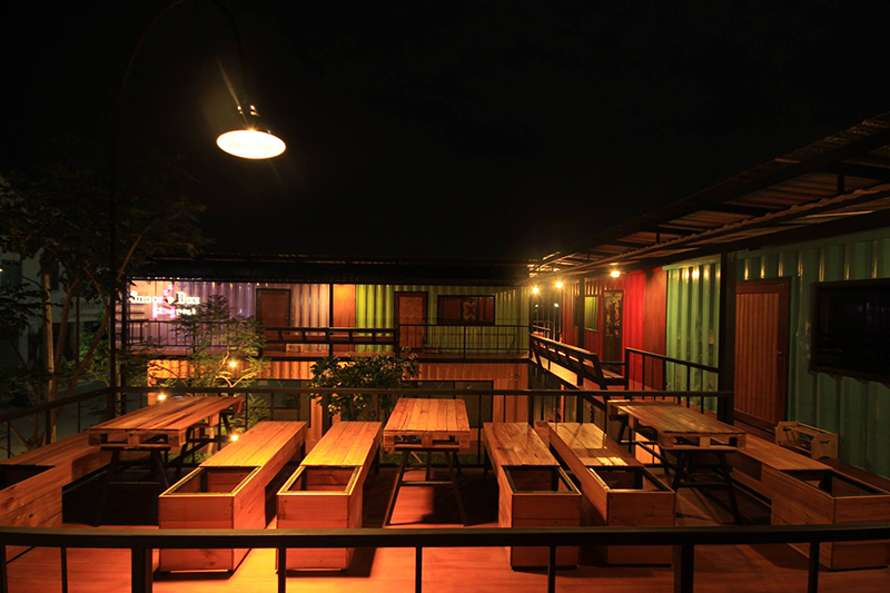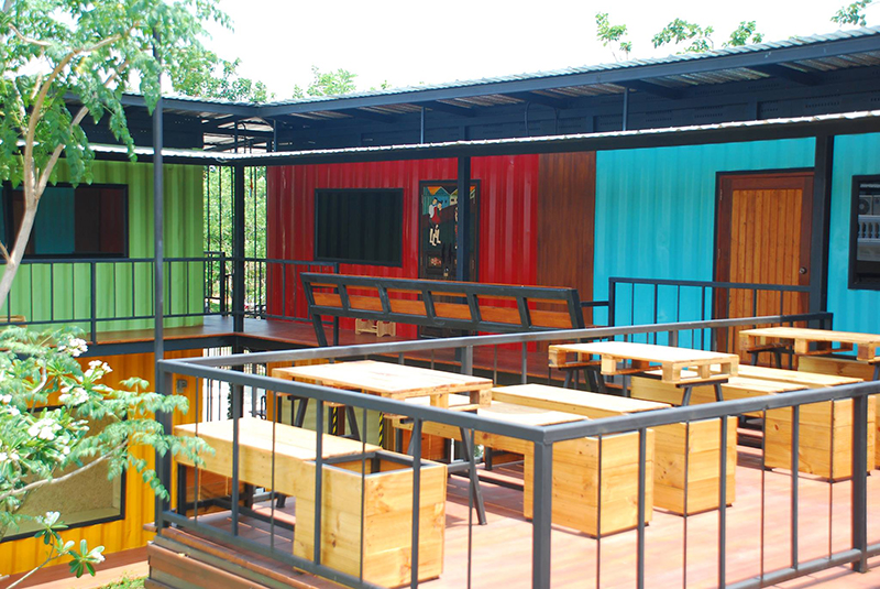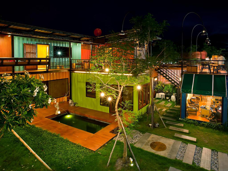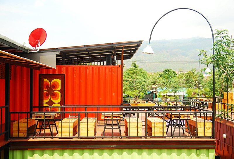 清邁是泰國(guó)著名的旅行景點(diǎn),因此也催生出“咖啡館式旅館”這種轉(zhuǎn)型升級(jí)的建筑。或許他原本就是一家咖啡館,大大的招牌懸掛在建筑的上方,選用橙色的外殼完美地將集裝箱“偽裝”成一間小木屋。