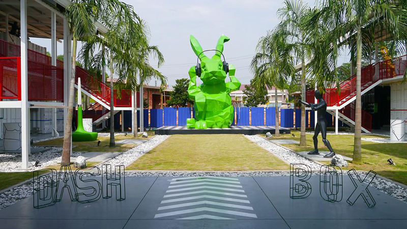 這個酒店的占地面積很大,還有自己的品牌特色。一直巨大的綠色聽歌兔子就是他們的標志,離不開高新科技的光環——電子音樂設備。而這里就是標準的度假區呀!