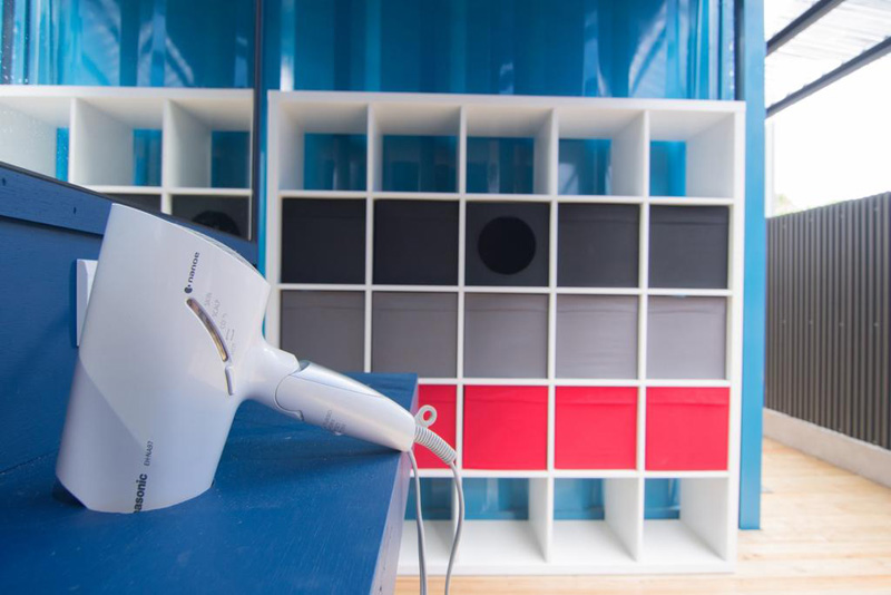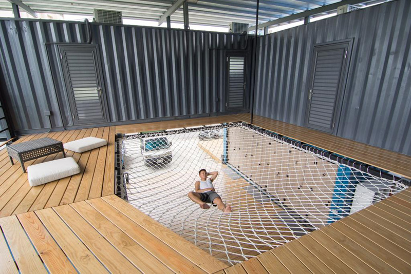 位于臺灣小琉球,這里有一座集裝箱改造而成的青年旅舍,名為【琉潛集裝箱潛水旅館】。旅舍的外殼色調以“藍”為主,突顯潛水主題。其中最有趣的設置在旅舍中部的二樓層里——鋼架構和木板搭建而成的平臺是中空的,并用鏤空的繩網填充,打造了一張舒適的網床。旅客們可以在躺在上面休息,還能與樓下的人互動,但是要注意墜物安全。