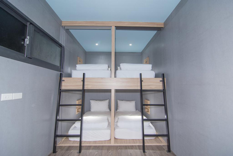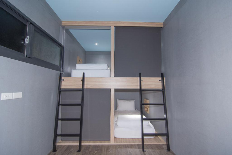 臥室遵循經濟適用原則,一個垂直的空間設置了四個太空睡艙。艙與艙之間以木板相隔,小巧的空間內僅夠放置一張單人睡床。為了保證私密性,床邊的窗簾是可以拉下來的,每張床的頂部還設置了頂燈,這樣就不怕打擾到別人休息了。