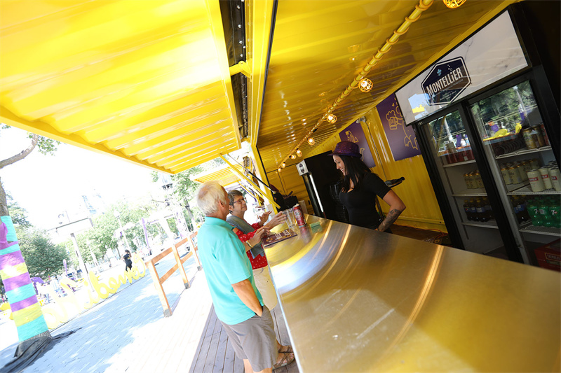 集裝箱被涂上了節日的專屬顏色——黃色和紫色交替出現,門前豎有節日的雕塑牌。你會發現一些集裝箱被“挖”了一個售賣窗口,這其實是影院墻壁的多用。整體來看集裝箱是作為影院的一面圍墻,但細看它卻是一個個獨立的集裝箱商店。