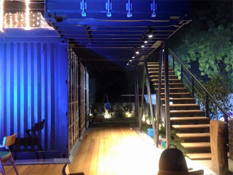 北面是由兩個平行排列的較小集裝箱形成的廚房。除此之外,通過入口門廳,人們登上金屬懸臂樓梯到露臺,作為自助餐廳或戶外聚會區(qū)。