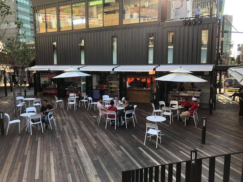 上到三層則是商場的最高點了,你將擁有一個寬敞的露天平臺,立足于底層的鐵箱子之上,一個也是由集裝箱改造而成的飲品店設置在一角為游客提供“天臺咖啡”服務,享受真的極致了!