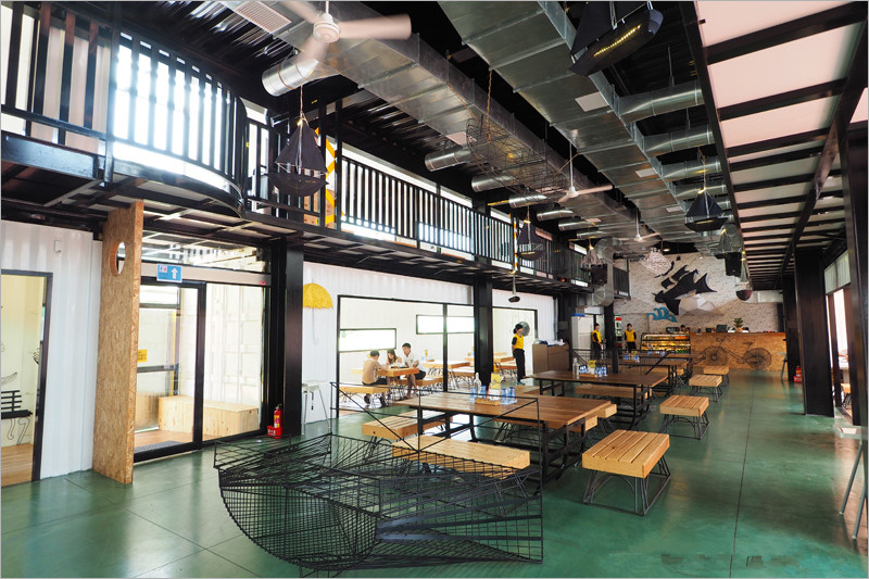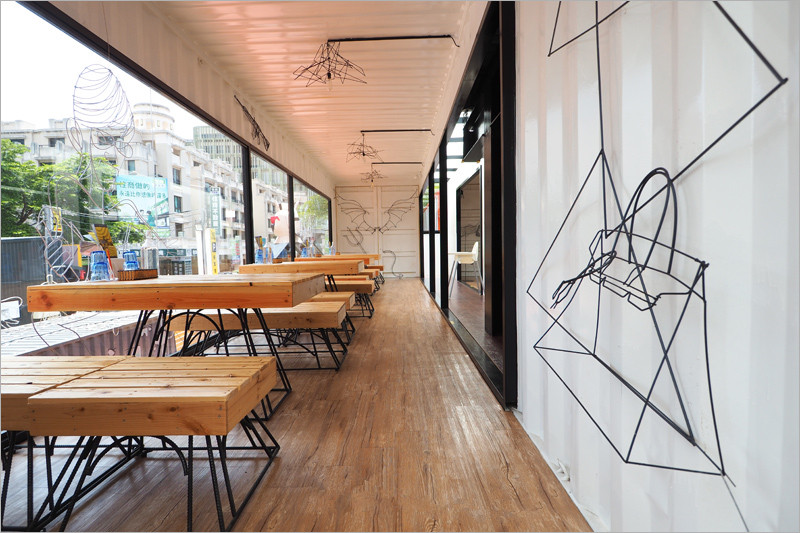集裝箱內(nèi)采用了大量的木質(zhì)材料和家具,家具采用鐵制的各種造型和木板相結(jié)合,簡約時(shí)尚。建筑內(nèi)部是一個(gè)復(fù)合式的餐廳,兩層都可供客人使用,墻面都畫上了Q版的經(jīng)典人物圖像,游客可以和這些造型各異的圖像拍照留念。除此以外,園區(qū)還有特別的鐵絲藝術(shù)飾品,鐵絲環(huán)繞成不同的物品造型,獨(dú)特吸引。