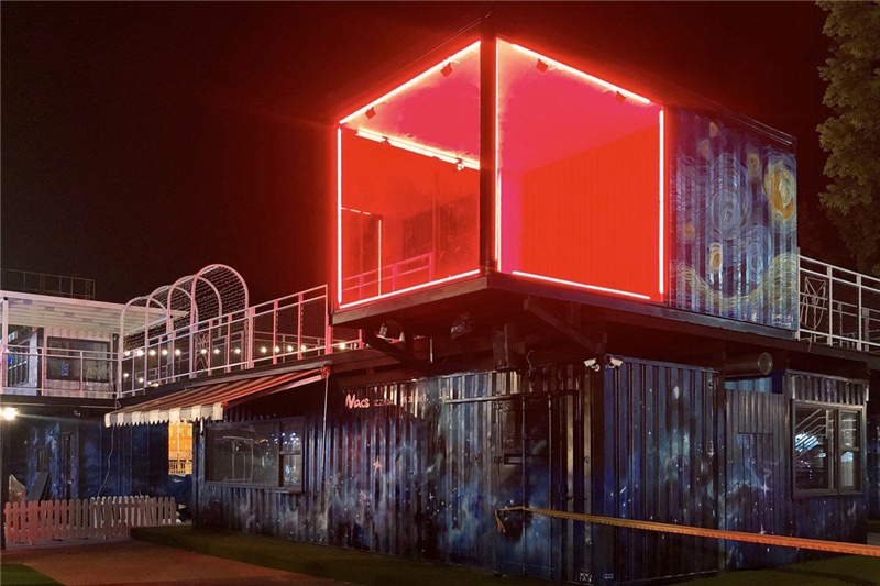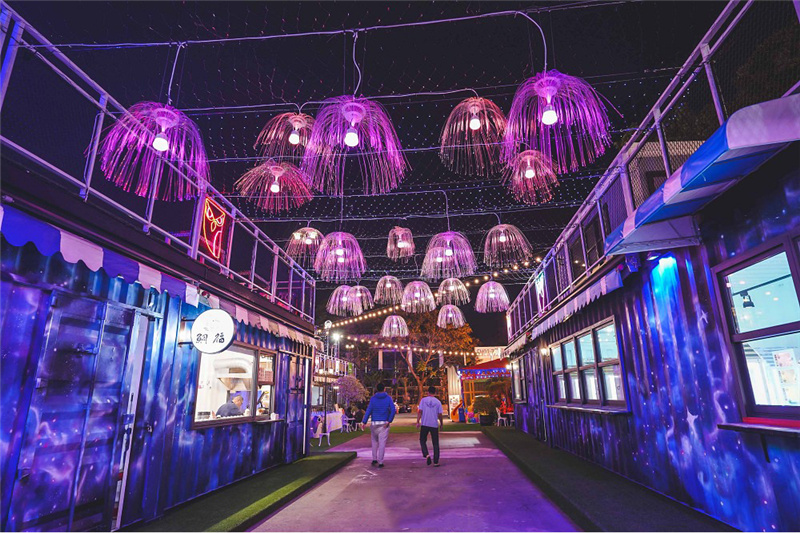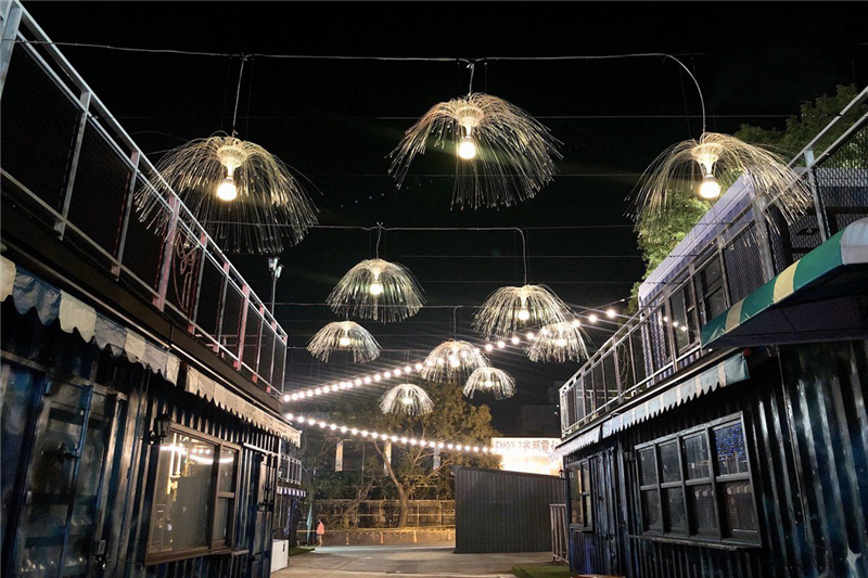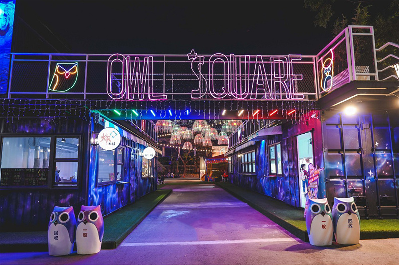 這個貓頭鷹廣場是由多個集裝箱組成的,一樓有餐飲品牌進駐,包括披薩、炸雞等,二樓是酒館。在集裝箱街道里走過,抬頭會看見許多水母LED燈被吊在箱頂,不停地更換顏色,炫酷又極具創意!