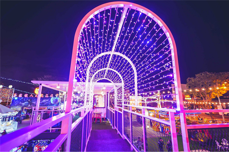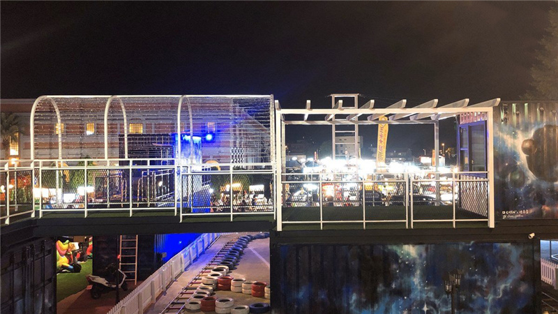 走上廣場的二層,一個浪漫的燈光拱門佇立在唯一一家進駐的酒吧前,鋼制的架子和欄桿裝點著這個集裝箱酒吧。二層的環境更加通風舒適,而且與一層的燈光效果不同,你可以在這里眺望到草鞋墩的夜市全景。