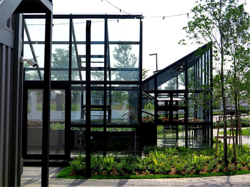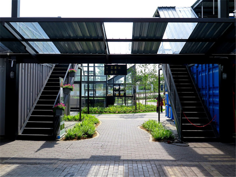 該集裝箱公園內(nèi)建設(shè)了餐飲一條街,各種各樣的小餐館集成在聯(lián)排的集裝箱模塊中,并用不同的外殼顏色區(qū)分不同的店面。街道中間搭建了遮陽(yáng)的頂棚,并放置了休閑的桌椅在走道上,可供游客們休息就餐。