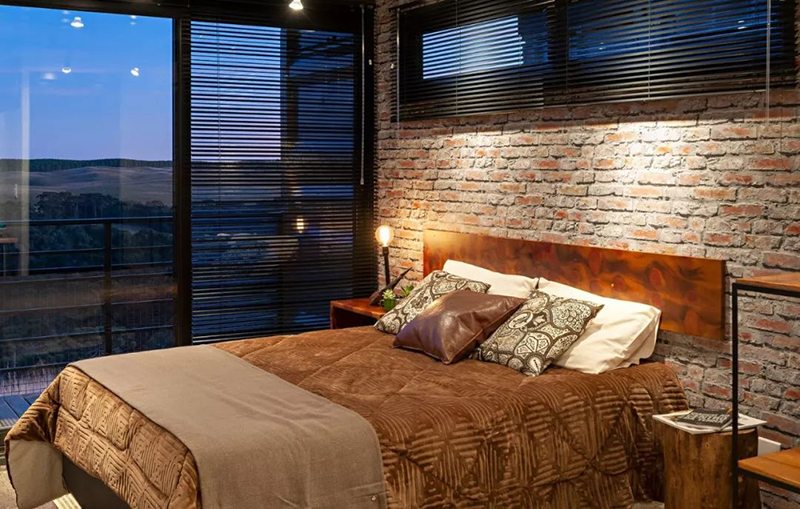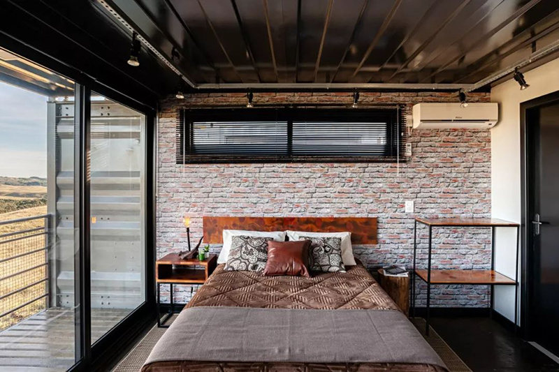 該項目作為一個度假居所,在這里客人可以享受到最好的視野,在戰略位置的大開口創造了景觀框架。 巨大的玻璃空間通向門廊,這是原有集裝箱門和預制混凝土平臺創造的結構的突破。 這些跨度接收了水平百葉窗,作為調節自然光線進入的屏障。 人工照明是通過金屬電纜托盤與聚光燈和 led 燈,創造景觀效果,突出鄉村磚墻紙和自然木雕墻壁。