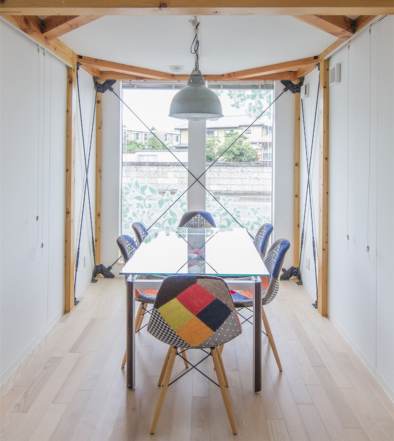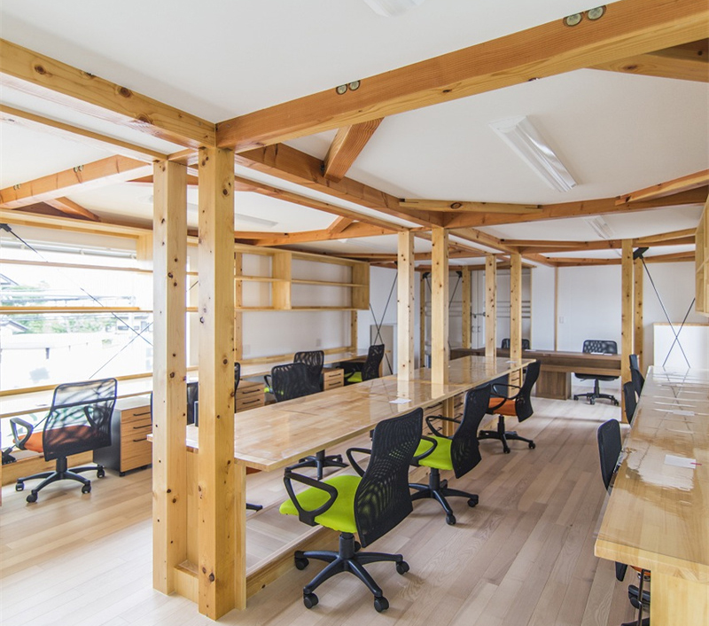 首先忽略木架的實用性,仔細看看是不是覺得結構很特別?縱橫交錯的條框其實連接著辦公桌、書柜和門框,實際是將家具融入到了建筑當中。此時的木架也就不再只是充當穩固結構的功能——那只是它的“假動作”,真動作應該是穩固的同時起到裝潢的效果。