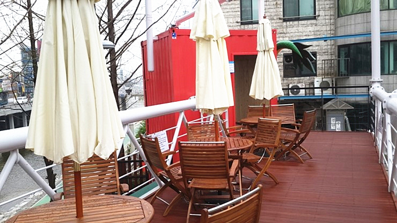 在綠色集裝箱的頂部作了結構加固,并搭建了一個休閑陽臺。棕色的戶外木地板搭配同色系的桌椅,讓人感覺十分親近自然。