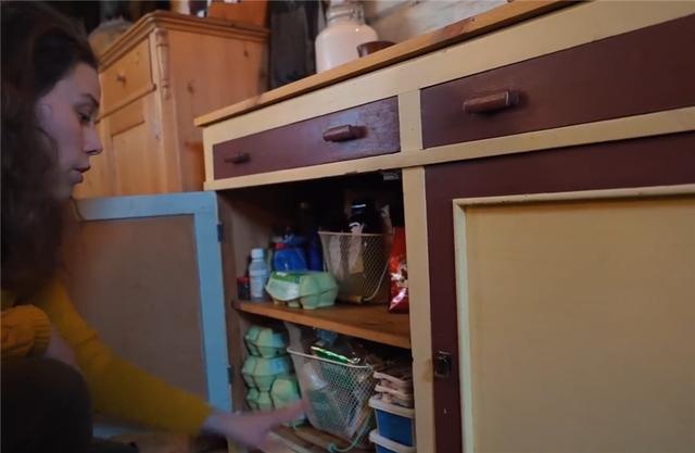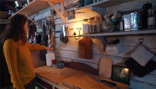 再往里走去,是夫妻倆的小廚房,同樣沒有任何電器設備,一張小案板、幾個存放食物的瓶瓶罐罐,就是廚房的全部家伙什兒~有些中世紀農場生活的感覺。做飯要到一旁的爐子上生火去做,后面我們會看到。