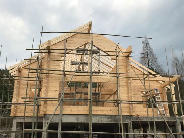 屋子的外立面是由20層木條壘砌起來的,木條通過吊機升到空中,工人師傅扶著木條一層層往上壘,每天可以壘3層。到了第7天,就差不多壘完了所有墻面,第8天開始搭建主梁和船條。屋子的外立面和屋頂,大致成型只需要10天。屋頂面的裝修和瓦片的鋪裝大概又花了10天。