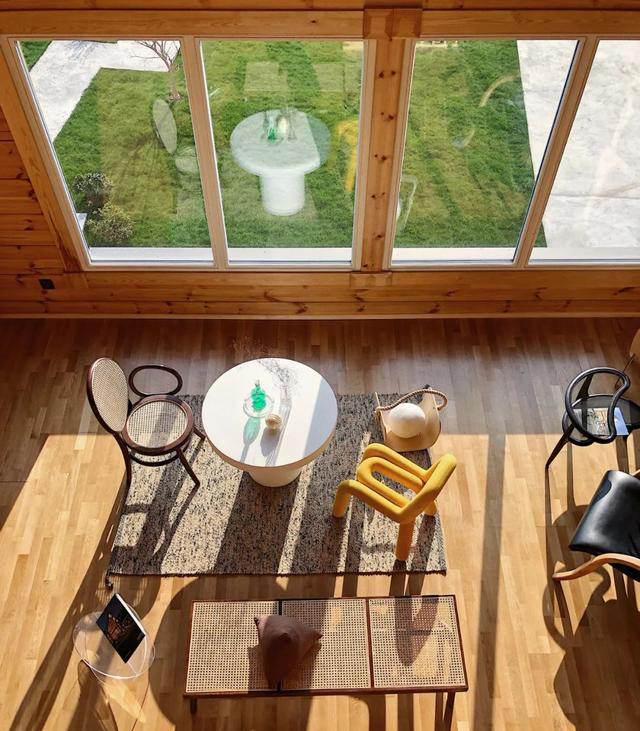 杭州的雨水多,木結構的房子需要遠離潮濕的地面,同時也需要防蟲,所以Frank決定將一樓做成混凝土的樣式。Frank研究了很多芬蘭木屋的建造方法,希望能借鑒一些經驗:“芬蘭有極晝極夜,所以他們在室內的時間很多,會花很多心思在公共空間的設計上。所以我們木屋的結構,臥室也會偏小,但是公共空間會比較開闊。二樓有一個超大的落地窗玻璃,視野很廣闊。”