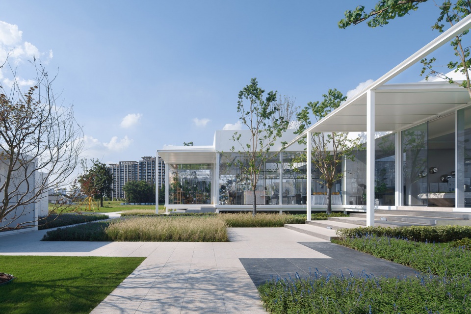 基地內有一棵樹,售樓處采用L形態朝向樹打開,與兩個樣板房體塊圍合出院落,院與樹成為了建筑的視覺中心,整個參觀動線圍繞著院子展開。洽談區作為動線的終點面向大運河展開。洽談區共九個模塊,我們朝向河面方向推出一個模塊,面向運河形成一個凸出的三面臨空的盒子作為茶室。抽離的盒子在洽談區中心留下一個庭院,洽談區圍繞庭院形成內外被自然包裹的流動空間。模型區與洽談區之間增加一個庭院從而保證所有的模塊都能直面景觀,實現內與外的相互滲透。