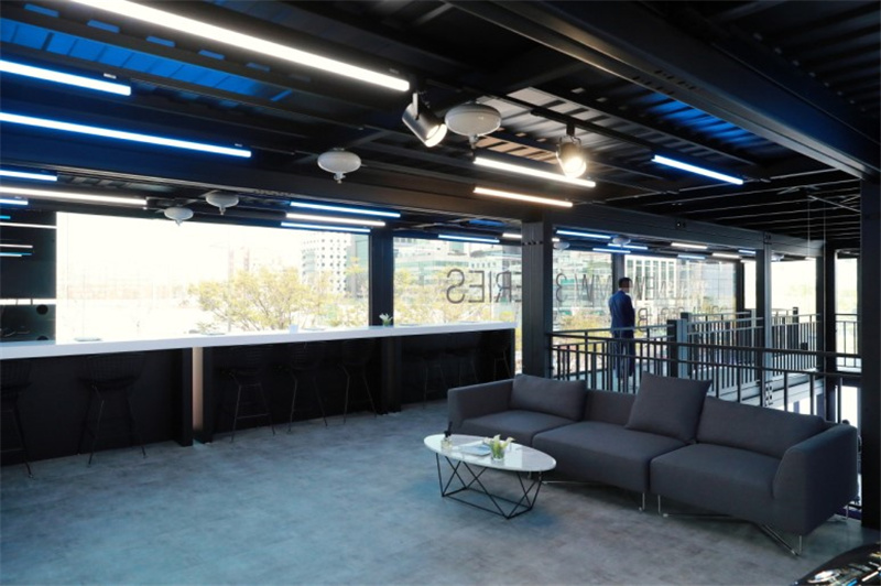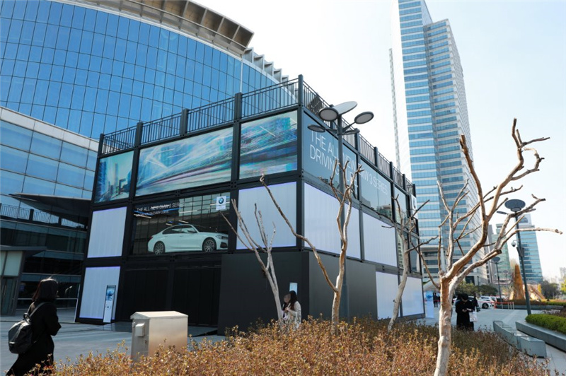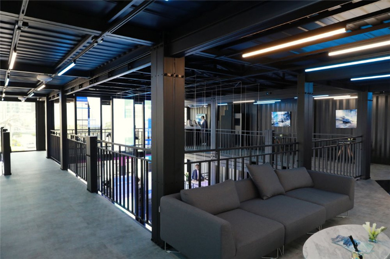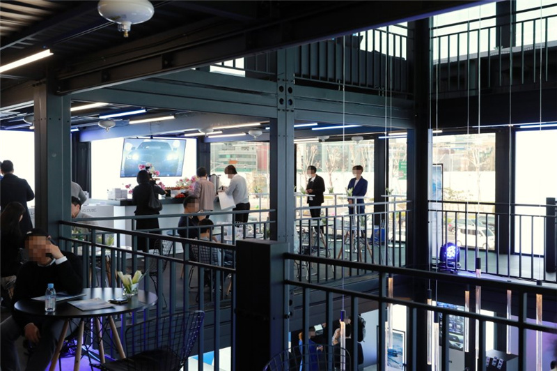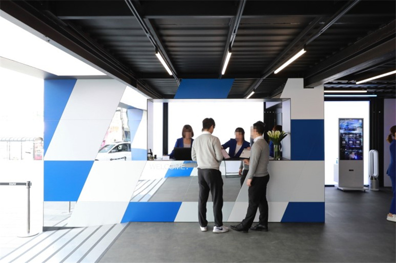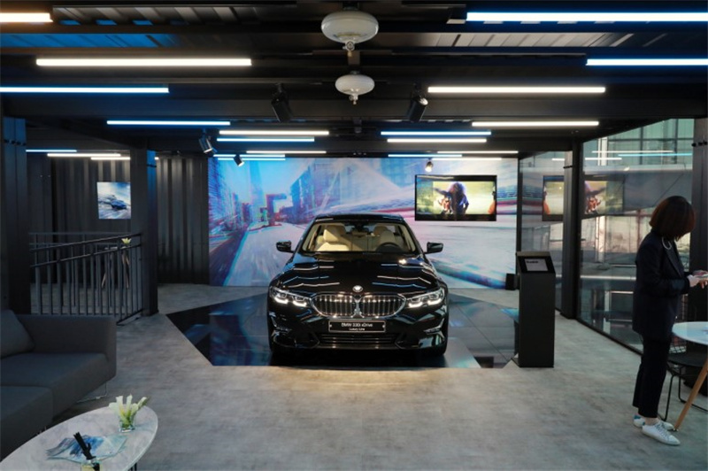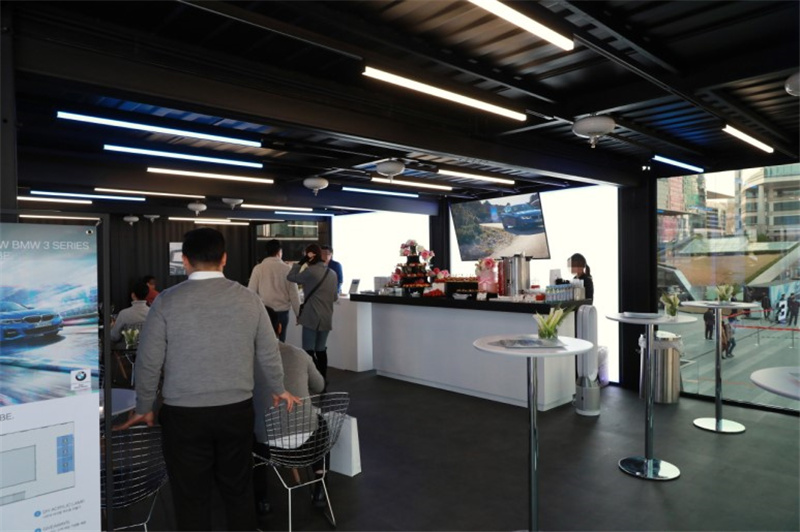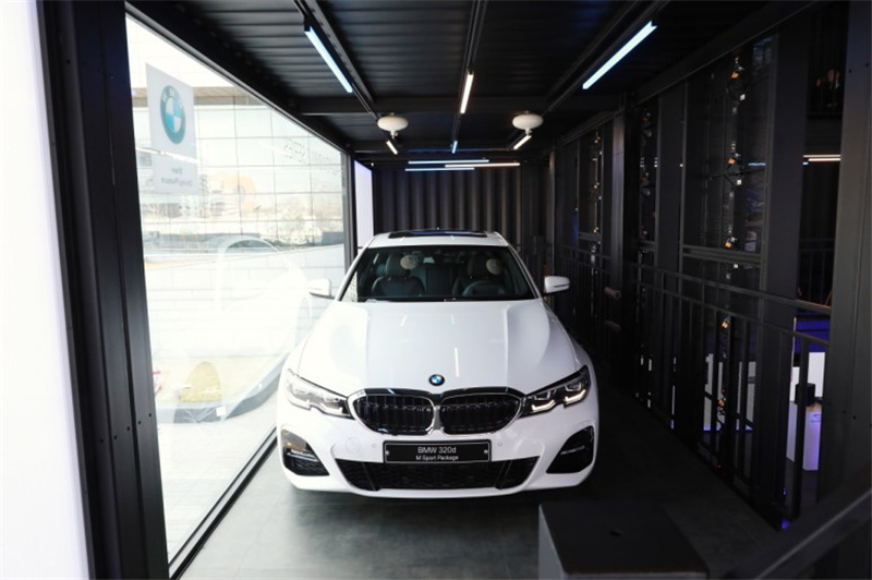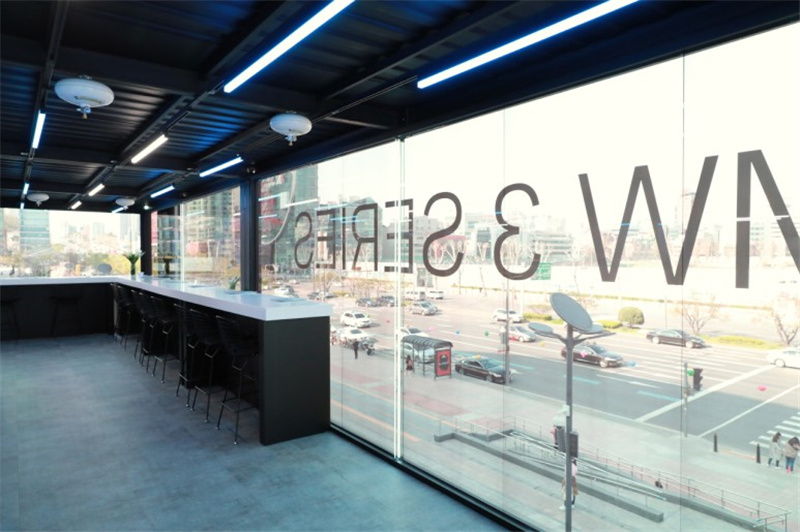 這個寶馬展廳由多個集裝箱和鋼架構組合構建而成,但是波浪板箱壁卻被落地玻璃所替換,營造了一種高級商務感;同時,這樣的設計也會為室內的透光帶來便利,讓環境更為明亮一些。