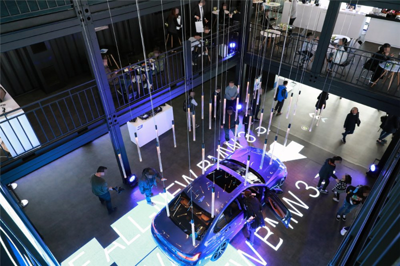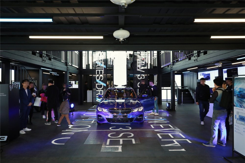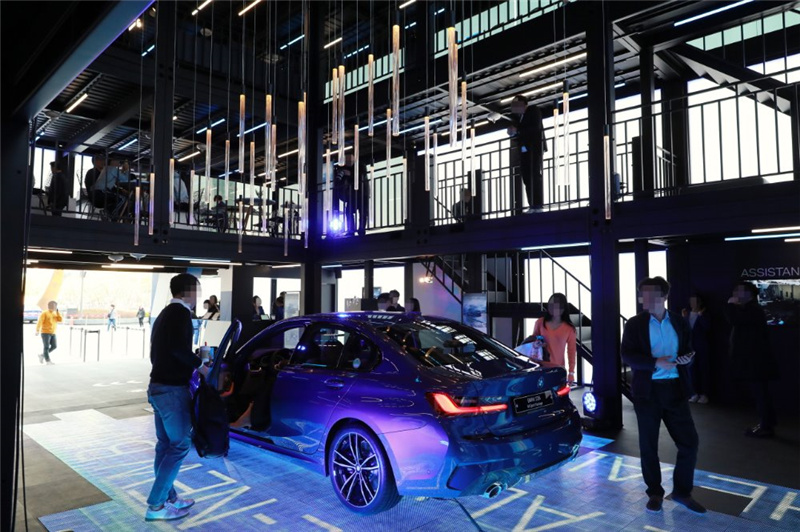 和許多極具科技感的展廳一樣,這座寶馬的展廳也是用了全黑的建筑背景,將室內的燈光效果和車身突顯出來。因此,會發現現場的燈都是以線條。